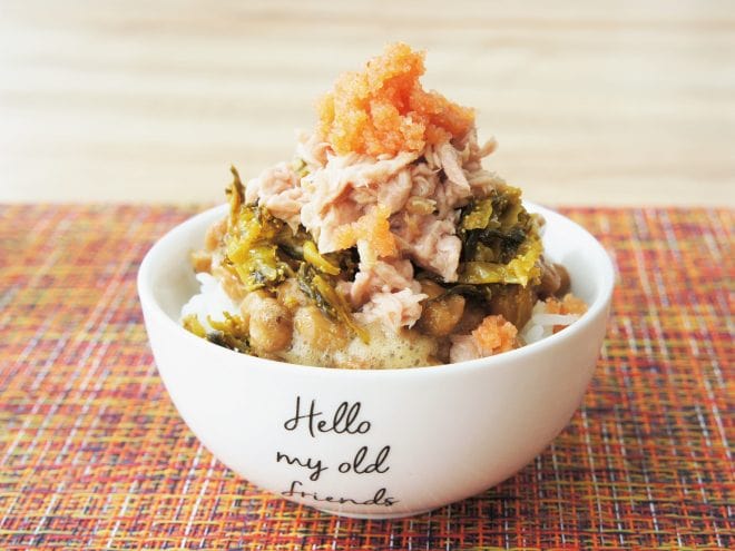 納豆(丹念納豆)、明太子、高菜、シーチキン、ご飯