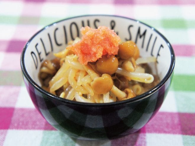 納豆(丹念納豆)、もやし、なめこ、ポン酢、明太子