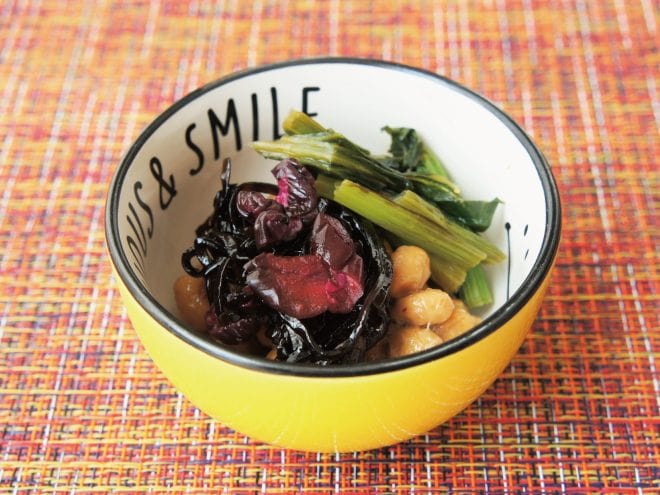 ④器に、納豆、小松菜、しば漬けを盛りつけて完成です。