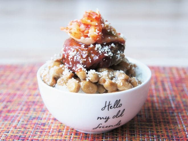 ⑤お茶碗に、ご飯、納豆、③、④のソース、粉チーズ、白菜キムチをのせたら完成です。