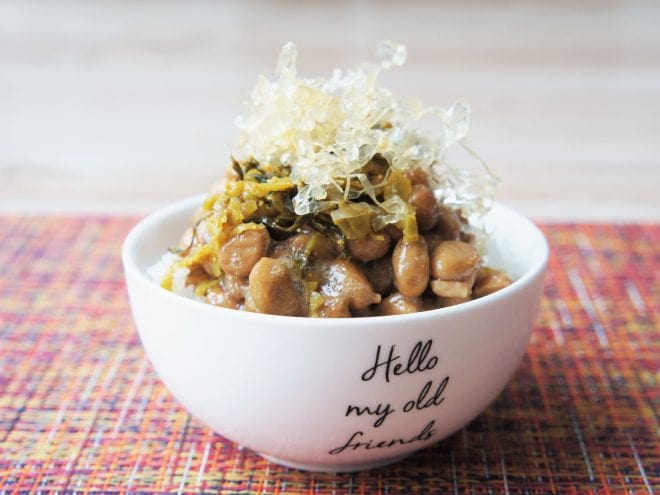 ①お茶碗にご飯をついだら、よく混ぜた納豆をかけます。
