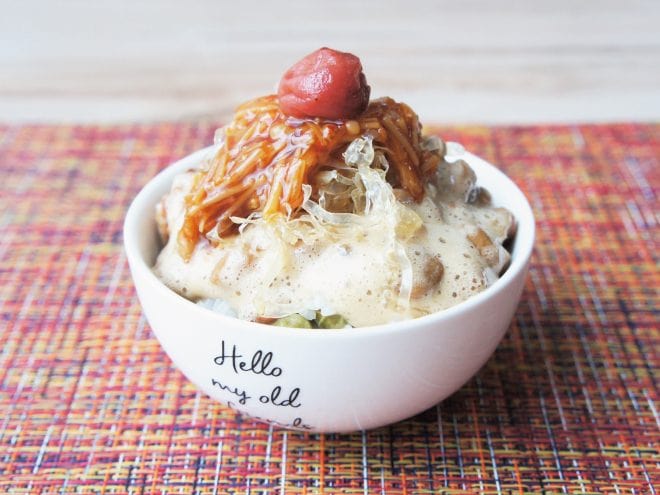 ③スルメの佃煮と、キムチなめ茸をかけたら、梅をのせて完成です。