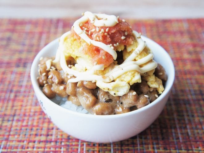 納豆(丹念納豆)、卵、明太子、マヨネーズ、ごま、ご飯