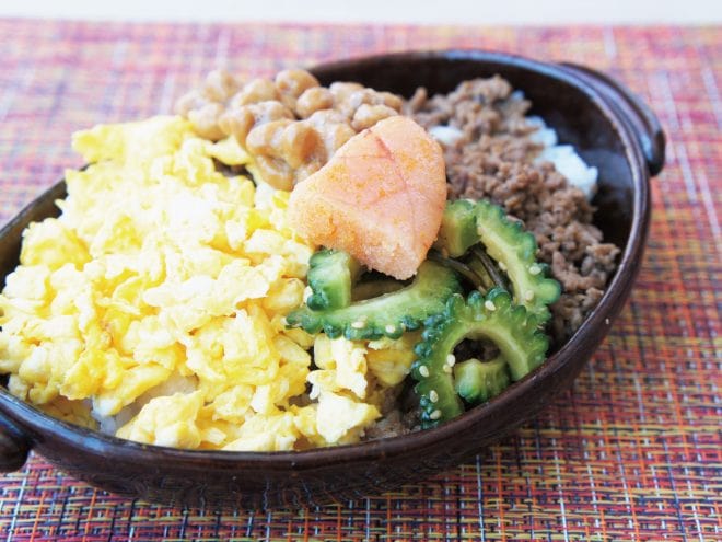 ⑥器にご飯を盛り付けたら、そぼろ、たまご、ゴーヤ漬け、納豆、明太子をのせて完成です。