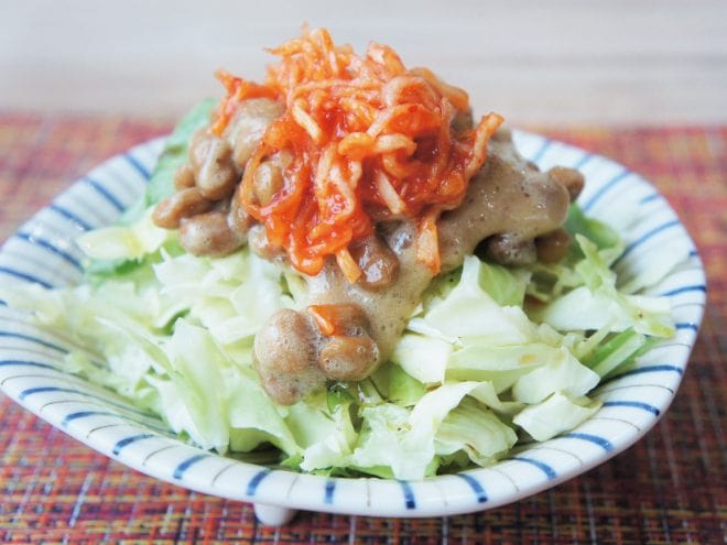 納豆(丹念納豆)、ハリハリキムチ、キャベツ、水菜、ポン酢、オリーブオイル、粗びき塩コショウ