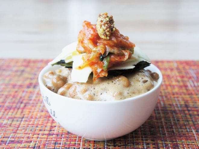 納豆(丹念納豆)、キムチ、マスタード、スライスチーズ、海苔、ご飯