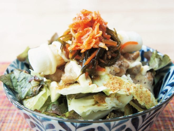 納豆(丹念納豆)、キャベツ、レタス、ちくわ、ハリハリキムチ、松前漬け、マヨネーズ、ポン酢、すりごま、オリーブオイル