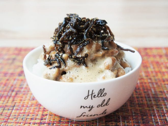 ①お茶碗にご飯をついだら、よく混ぜた納豆をかけます。