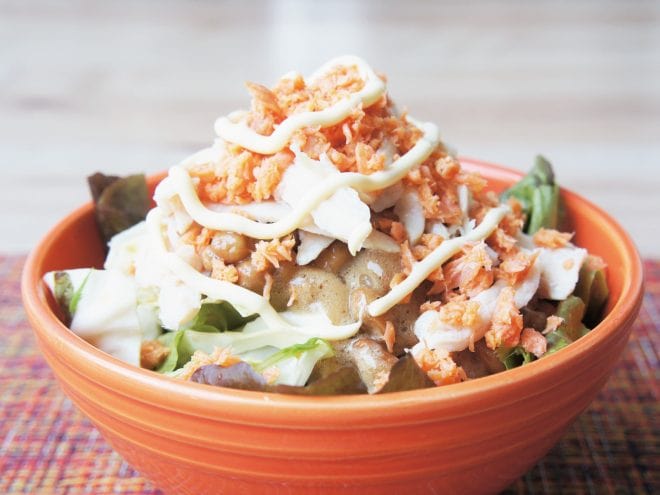 納豆(丹念納豆)、キャベツ、レタス、ポン酢、オリーブオイル、シャケフレーク、ささみ、マヨネーズ