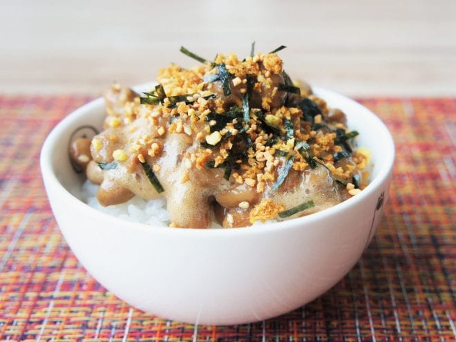 ①お茶碗にご飯をついだら、よく混ぜた納豆をかけます。