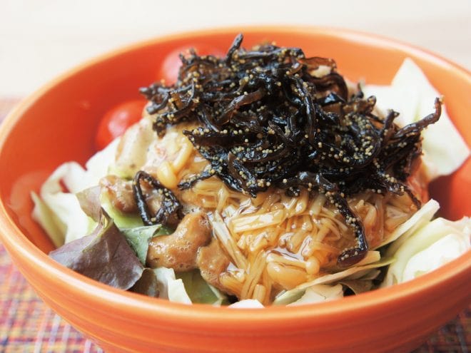 納豆(丹念納豆)、キャベツ、レタス、ポン酢、なめ茸、数の子きくらげ