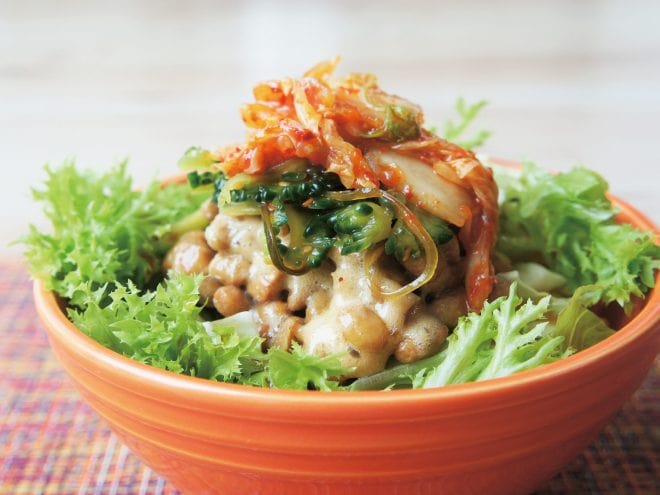 納豆(丹念納豆)、ゴーヤ、酢、砂糖、薄口醤油、濃口醤油、塩昆布、白ごま、キャベツ、レタス、キムチ、オリーブオイル、ポン酢