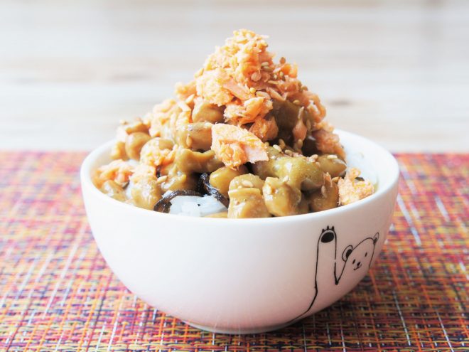 納豆塩昆布シャケご飯 材料納豆(丹念納豆)、塩昆布、シャケフレーク、金ゴマ、ご飯納豆塩昆布シャケご飯の作り方①お茶碗にご飯をついだら、塩昆布をのせてお湯をかけます。②よく混ぜた納豆、シャケフレーク、金ゴマをかけて完成です。