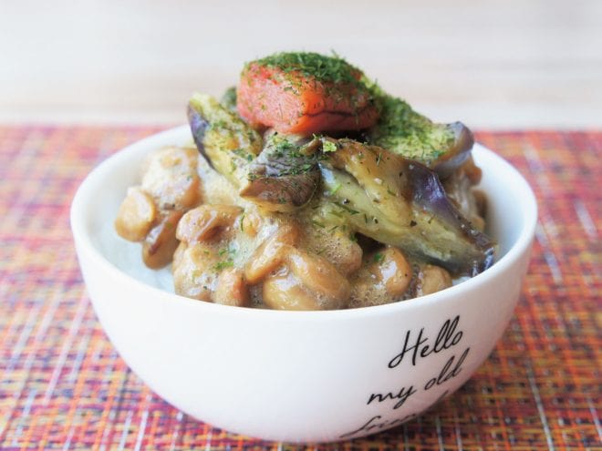 納豆(丹念納豆)、茄子、麺つゆ、ポン酢、明太子、青のり、ご飯