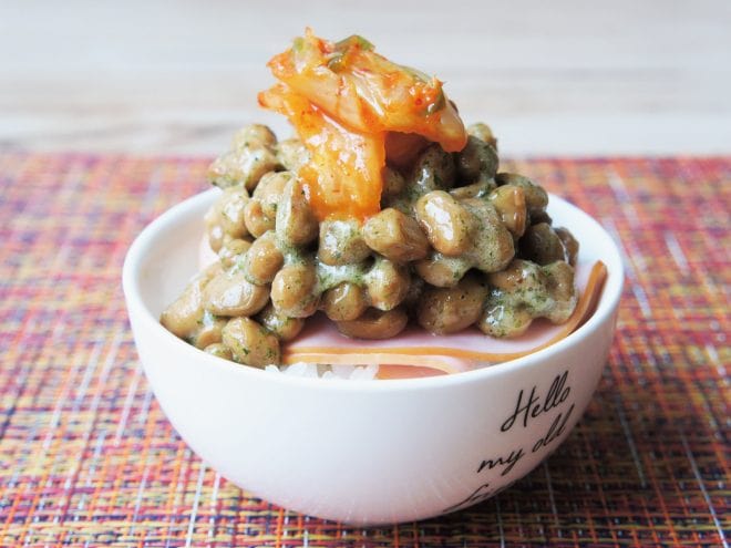 納豆(丹念納豆)、青のり、ハム、キムチ、ご飯