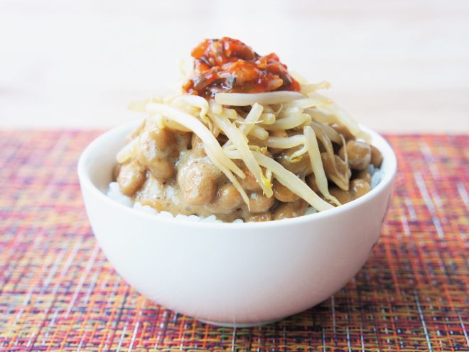 納豆モヤシ炒めたこキムチご飯 材料納豆(丹念納豆)、もやし、中華あじ、ポン酢、粗挽き塩コショウ、たこキムチ、ご飯納豆モヤシ炒めたこキムチご飯の作り方①もやしは、よく洗って、ザルに上げておきます。②熱したフライパンに、油、もやしを入れて炒めます。③中華あじ、ポン酢、粗挽き塩コショウで味を調えます。④お茶碗にご飯をついだら、よく混ぜた納豆をかけます。⑤モヤシ炒めと、たこキムチをのせたら完成です。