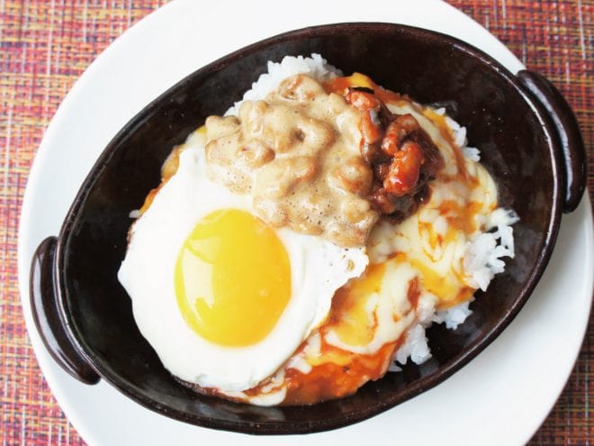納豆(丹念納豆)、チーズ、ミートソース、卵、たこキムチ、ご飯
