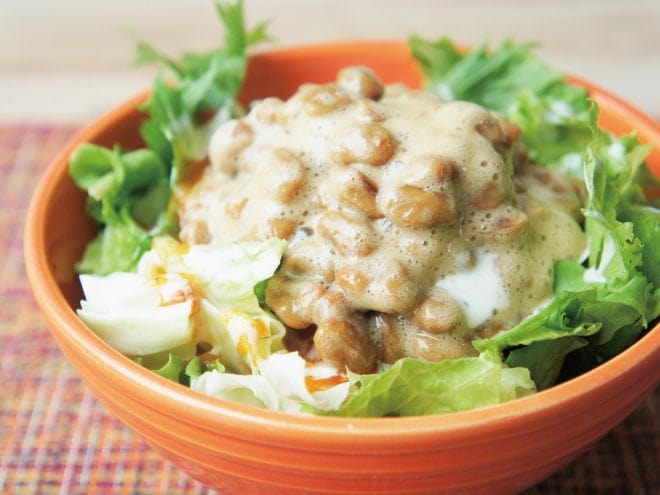 納豆(丹念納豆)、キャベツ、水菜、ミートソース、シーザードレッシング