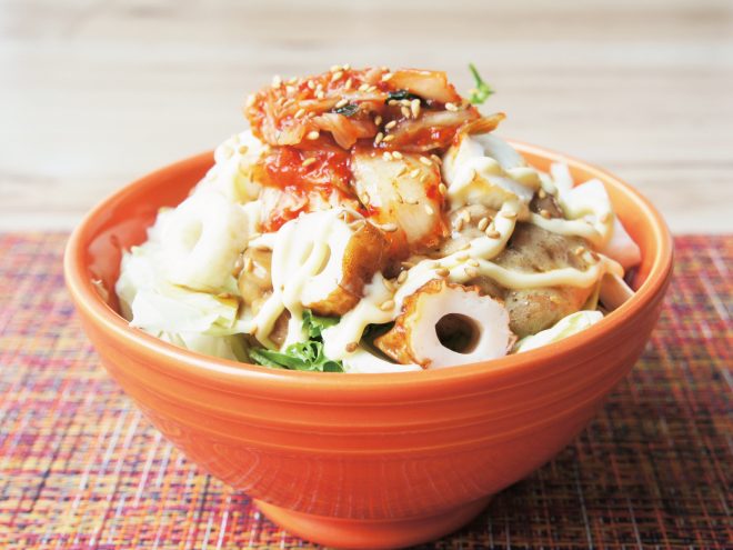 納豆(丹念納豆)、キャベツ、レタス、ちくわ、キムチ、ごま、マヨネーズ、ポン酢
