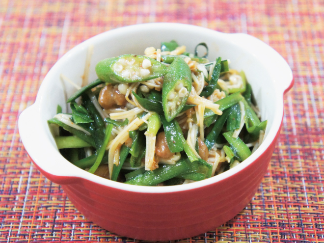 ニラとオクラの納豆炒め 材料納豆(丹念納豆)、ニラ、オクラ、えのき、薄口醤油、中華ダシ、にんにくチューブ、粗挽き塩コショウニラとオクラの納豆炒めの作り方①ニラ、おくら、えのきは、食べやすい長さにカットします。②熱したフライパンに、油を入れたら、①を加えてよく炒めます。③薄口醤油、中華ダシ、にんにくチューブ、粗挽き塩コショウで味を調えます。④最後に納豆を加えてサッと炒め、器に盛りつけたら完成です。