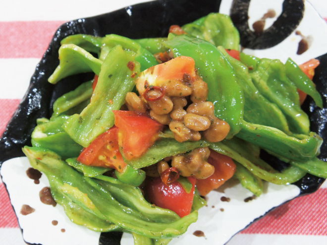 ぺペロンピーマン納豆 材料納豆(丹念納豆)、ピーマン、トマト、にんにく、とうがらし、オリーブオイルぺペロンピーマン納豆の作り方①ピーマンは、種を取り除いて、食べやすい大きさにカットします。②フライパンに、オリーブオイルを入れたら、刻みにんにくを炒めて香りを出します。③ピーマンを加えて焼き目をつけたら、カットトマトと唐辛子を加え、サッと炒めて完成です。