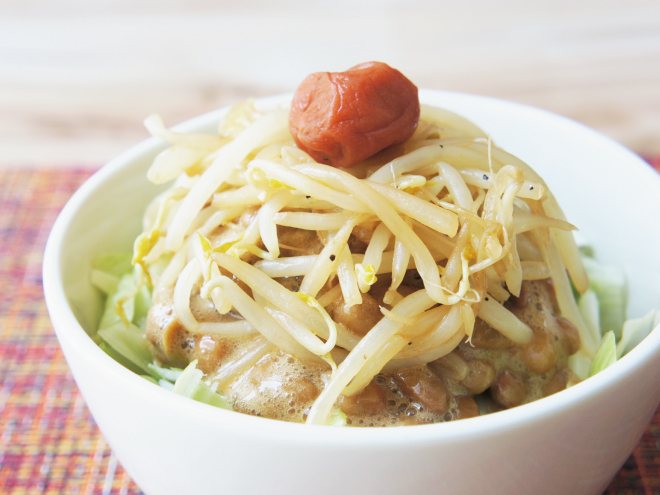 納豆もやし炒め梅サラダ 材料納豆(丹念納豆)、もやし、中華あじ、ウスターソース、粗びき塩コショウ、キャベツ、梅、ポン酢納豆もやし炒め梅サラダの作り方①もやしはよく洗い、ザルに上げて水を切っておきます。②フライパンに、油を入れたら、もやしを入れて炒めます。③中華あじ、ウスターソース、粗びき塩コショウで味を調えます。④キャベツを、食べやすい大きさに切ったら、器に盛りつけポン酢をかけます。⑤よく混ぜた納豆、もやし炒め、梅をのせたら完成です。