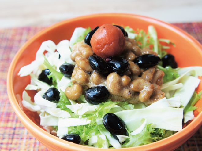 黒豆甘煮納豆サラダ 材料納豆(丹念納豆)、キャベツ、レタス、黒豆甘煮、梅、ポン酢黒豆甘煮納豆サラダの作り方①キャベツとレタスは、食べやすい大きさに切ったら、器に盛りつけます。②ポン酢とよく混ぜた納豆をかけます。③甘く煮た黒豆と、梅をのせたら完成です。