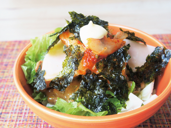 キムチのりマヨ納豆サラダ 材料納豆(丹念納豆)、キャベツ、レタス、キムチ、韓国のり、ハム、マヨネーズ、ポン酢キムチのりマヨ納豆サラダの作り方①キャベツとレタスは、食べやすい大きさに切ったら、器に盛りつけます。②よく混ぜた納豆をかけたら、ハムをのせます。③ポン酢をかけて、キムチをのせたら、韓国のりを散らしマヨネーズを添えて完成です。