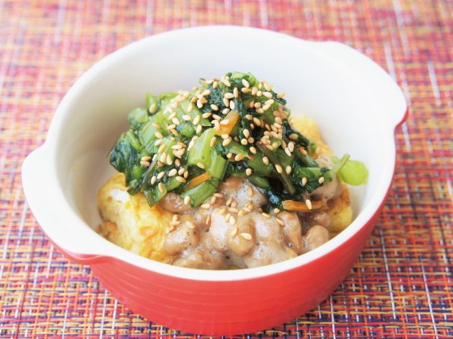 ④器に、チーズ卵焼きをのせて、よく混ぜた納豆をかけます。