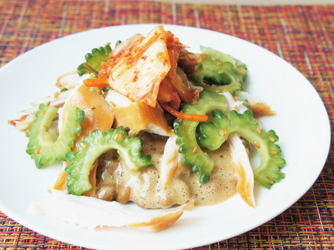 納豆(丹念納豆)、ゴーヤ、塩、酢、砂糖、薄口醤油、濃口醤油、塩昆布、白ごま、スモークチキン、キムチ