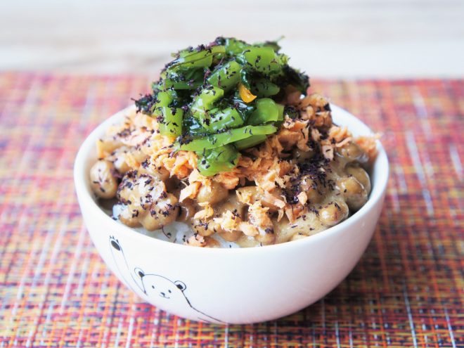①お茶碗にご飯をついだら、よく混ぜた納豆をかけます。