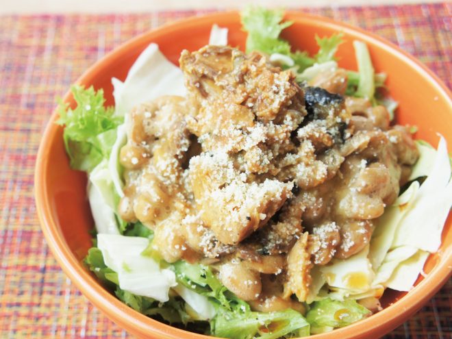 サバの味噌煮納豆サラダ 材料納豆(丹念納豆)、キャベツ、レタス、サバの味噌煮缶詰、粉チーズ、ポン酢、粗びき塩コショウサバの味噌煮納豆サラダの作り方①キャベツとレタスは、食べやすい大きさに切ったら、器に盛りつけます。②ポン酢、粗びき塩コショウ、よく混ぜた納豆をかけます。③サバの味噌煮をのせたら、粉チーズをかけて完成です。