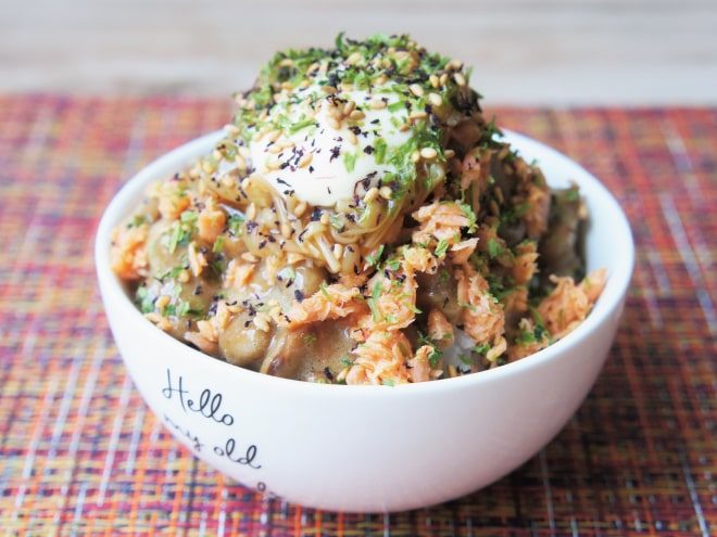 なめ茸マヨのりシャケ紫蘇納豆ご飯の作り方