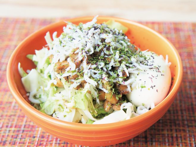 ゆで卵と青のり納豆しそしらすサラダ 材料納豆(丹念納豆)、キャベツ、レタス、卵、青のり、しそふりかけ、しらす、ポン酢ゆで卵と青のり納豆しそしらすサラダの作り方①卵を茹でて、ゆで卵を作ります。②キャベツとレタスは、食べやすい大きさに切ったら、器に盛りつけます。③ポン酢とよく混ぜた納豆をかけます。④ゆで卵を盛りつけたら、青のり、しそふりかけ、しらすをかけて完成です。