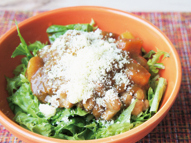 チーズカレー納豆サラダ 材料納豆(丹念納豆)、じゃがいも、にんじん、玉ねぎ、牛薄切り肉、カレールー、レタス、水菜、粉チーズ、ポン酢チーズカレー納豆サラダの作り方①皮をむいたじゃがいも、にんじんは、食べやすい大きさにカットし、玉ねぎは、薄切りにします。②鍋に、牛薄切り肉を入れて炒めたら、①を入れて炒めます。③水を入れて煮込み、カレールーを入れます。④レタス、水菜は、食べやすい大きさに切ったら、器に盛りつけます。⑤よく混ぜた納豆、ポン酢、カレー、粉チーズをかけたら完成です。