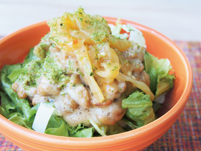 中華クラゲ青のり納豆サラダ 材料納豆(丹念納豆)、キャベツ、レタス、中華クラゲ、青のり、ポン酢中華クラゲ青のり納豆サラダの作り方①キャベツとレタスは、食べやすい大きさに切ったら、器に盛りつけます。②よく混ぜた納豆、ポン酢をかけます。③中華クラゲと、青のりをかけたら完成です。