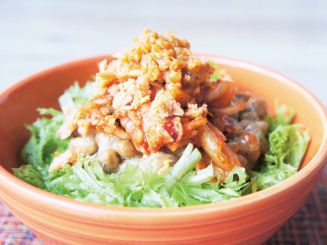 鮭明太キムチ納豆サラダ 材料納豆(丹念納豆)、レタス、キムチ、シャケフレーク、鮭明太、ポン酢鮭明太キムチ納豆サラダの作り方①レタスを、食べやすい大きさに切ったら、器に盛りつけます。②ポン酢と、よく混ぜた納豆をかけます。③キムチをのせたら、シャケフレーク、鮭明太をかけて完成です。