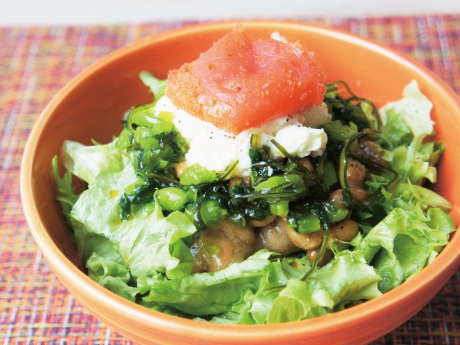 明太子野沢菜ポテサラ納豆サラダ 材料納豆(丹念納豆)、レタス、ポテトサラダ、野沢菜こんぶ、明太子、オリーブオイル、粗びき塩コショウ、ポン酢明太子野沢菜ポテサラ納豆サラダの作り方①レタスは、食べやすい大きさに切ったら、器に盛りつけます。②よく混ぜた納豆、ポテトサラダをのせたら、オリーブオイル、粗びき塩コショウ、ポン酢をかけます。③野沢菜こんぶと、明太子をのせて完成です。