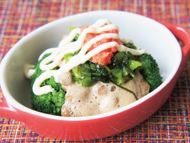 納豆(丹念納豆)、ブロッコリー、野沢菜こんぶ、明太子、マヨネーズ、塩