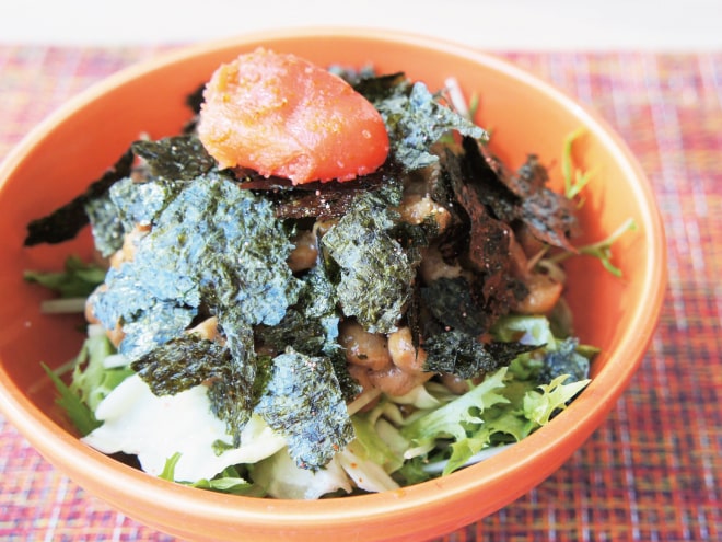 明太海苔と明太子納豆サラダ 材料納豆(丹念納豆)、レタス、キャベツ、水菜、明太海苔、明太子納豆、ポン酢、オリーブオイル、粗びき塩コショウ明太海苔と明太子納豆サラダの作り方①レタス、キャベツ、水菜は、食べやすい大きさに切ったら、器に盛りつけます。②ポン酢、オリーブオイル、粗びき塩コショウ、よく混ぜた納豆をかけます。③明太海苔をちぎって、たっぷりのせたら、さらに明太子をのせて完成です。