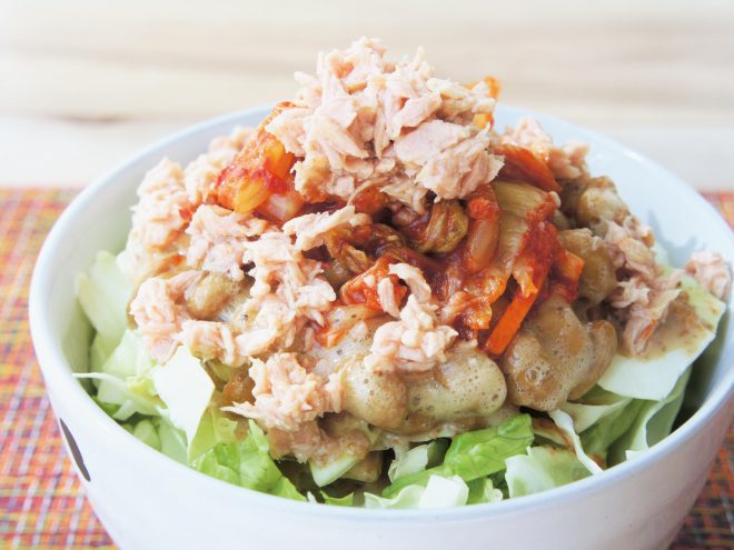 納豆(丹念納豆)、キャベツ、ごまダレ、シーチキン、キムチ