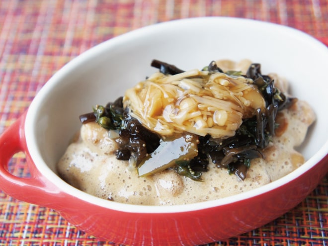 きくらげ高菜なめ茸納豆 材料納豆(丹念納豆)、きくらげ高菜のしぐれ、なめ茸きくらげ高菜なめ茸納豆の作り方①よく混ぜた納豆を、器に盛りつけます。②きくらげ高菜のしぐれと、なめ茸をかけたら完成です。きくらげのコリコリした食感、高菜のシャキシャキ、なめ茸のぬるっとした食感が楽しい納豆になります。