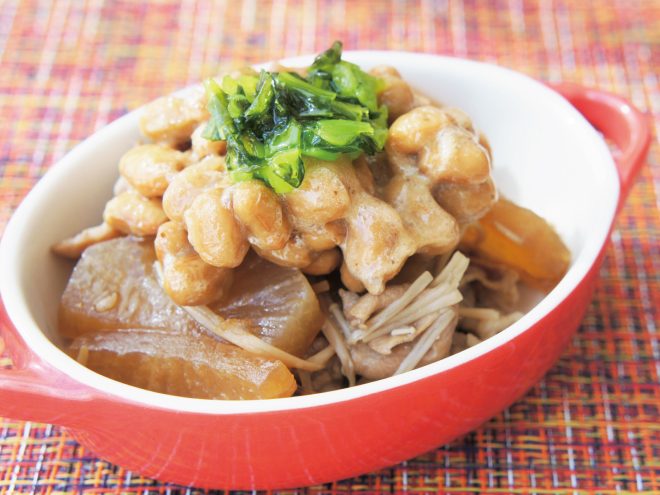 豚と大根の甘辛煮納豆 材料納豆(丹念納豆)、豚薄切り肉、大根、えのき、醤油、酒、砂糖、みりん、野沢菜こんぶ豚と大根の甘辛煮納豆の作り方①大根は皮を剥いて、食べやすい大きさにカットします。②えのきは、石ずきをカットしたら、割いて半分にカットします。③鍋に、豚肉を入れて軽く炒めたら、大根、浸かる程度の水、酒を入れて、大根が柔らかくなるまで煮ます。④醤油、砂糖、みりん、えのきを入れ味を調えたら、少し煮込みます。⑤器に盛り付けて、納豆と野沢菜こんぶをのせたら完成です。