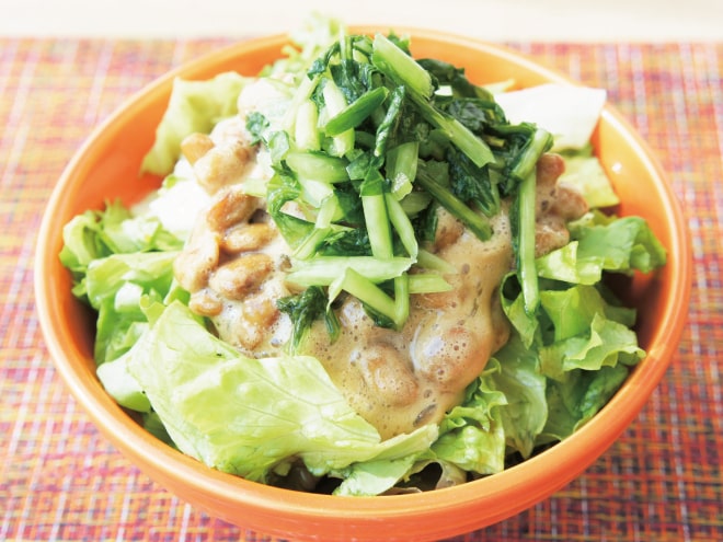 みぶ菜納豆サラダ 材料納豆(丹念納豆)、キャベツ、レタス、みぶ菜、ポン酢、オリーブオイル、粗びき塩コショウみぶ菜納豆サラダの作り方①キャベツとレタスは、食べやすい大きさに切ったら、器に盛りつけます。②ポン酢、オリーブオイル、粗びき塩コショウ、よく混ぜた納豆をかけます。③みぶ菜の漬物をのせたら完成です。