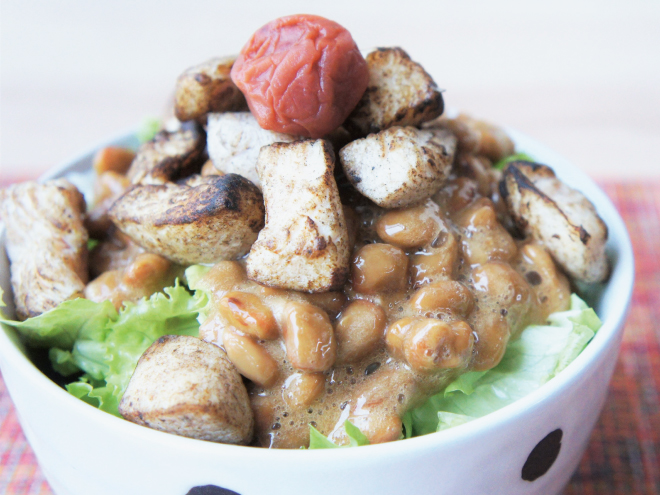 炭火焼き鶏と梅納豆サラダ 材料納豆(丹念納豆)、キャベツ、レタス、炭火焼き鶏、梅、ポン酢炭火焼き鶏と梅納豆サラダの作り方①キャベツとレタスは、食べやすい大きさに切ったら、器に盛りつけます。②ポン酢とよく混ぜた納豆をかけます。③炭火焼き鶏と、梅をのせたら完成です。