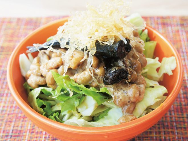 いわしとスルメの佃煮納豆サラダ 材料納豆(丹念納豆)、レタス、キャベツ、いわしの佃煮、スルメの佃煮、ポン酢いわしとスルメの佃煮納豆サラダの作り方①レタスとキャベツは、食べやすい大きさに切ったら、器に盛りつけます。②ポン酢と、よく混ぜた納豆をかけます。③いわしの佃煮、スルメの佃煮をのせたら、完成です。