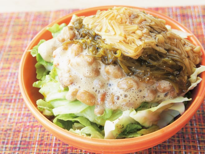 めかぶなめ茸納豆サラダ 材料納豆(丹念納豆)、キャベツ、レタス、子持ちめかぶ、なめ茸、ポン酢、オリーブオイル、粗びき塩コショウめかぶなめ茸納豆サラダの作り方①キャベツとレタスは、食べやすい大きさに切ったら、器に盛りつけます。②ポン酢、オリーブオイル、粗びき塩コショウ、よく混ぜた納豆をかけます。③子持ちめかぶと、なめ茸をかけたら完成です。
