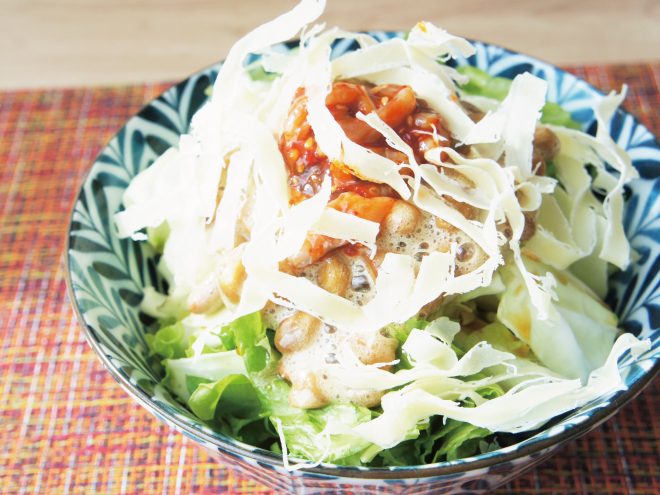 納豆(丹念納豆)、キャベツ、レタス、たこキムチ、削りチーズ、ポン酢、オリーブオイル、粗びき塩コショウ