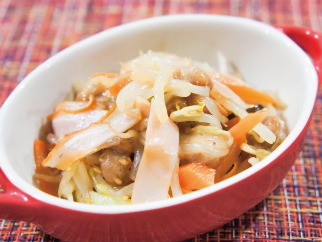 納豆(丹念納豆)、もやし、にんじん、ハム、酢、醤油、ごま油、砂糖、ごま