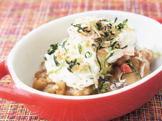 ポテサラちりめん納豆 材料納豆(丹念納豆)、梅野沢菜ちりめんの加工品、ポテトサラダポテサラちりめん納豆の作り方①よく混ぜた納豆を、器に盛りつけます。②梅野沢菜ちりめんと、ポテトサラダをかけたら、完成です。